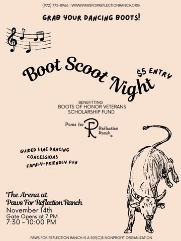 Join us for our Fall Boot Scoot Night! This event features guided line-dancing, concessions, and smiles all while raising money for our Veteran's Scholarship Fund!